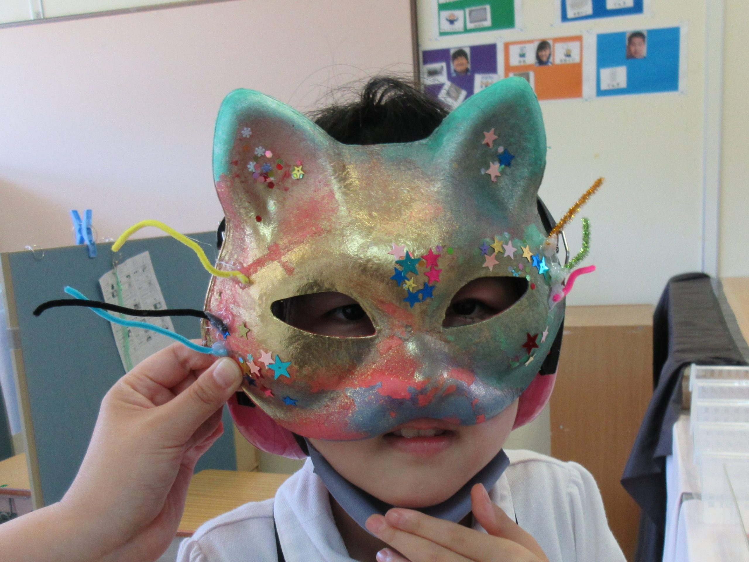 図工で7月から取り組んできた「猫のお面」が完成しました!