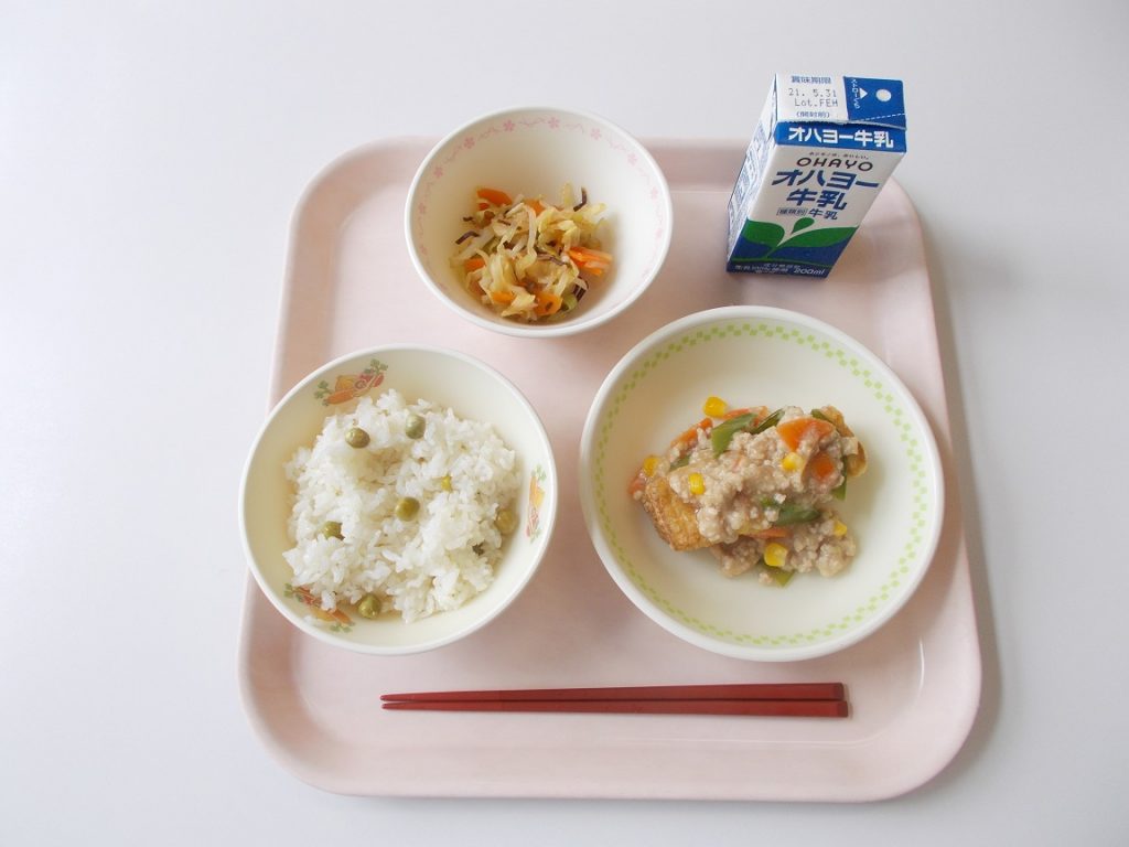 あらすかご飯 牛乳 揚げだし豆腐のみそあんかけ キャベツの昆布和え