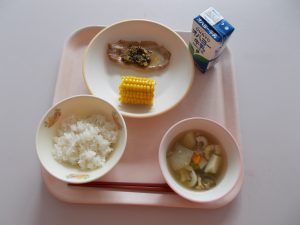 ご飯 牛乳 豚肉の香味ソース 茹でとうもろこし 夏のっぺ