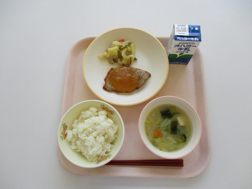 ご飯 牛乳 ぶた肉のアップルソースかけ じゃがいものソテー わかめのみそ汁