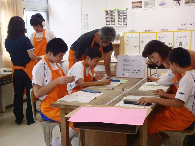 中学部の作業班で着用するためのエプロン60枚を、倉敷琴浦高等支援学校家政コースの皆さんに製作していただきました。水を使う紙すき班は鮮やかなブルー。農耕班は新鮮野菜のグリーン。物づくり班はファイトが出るオレンジ。サイズやデザインも各4種類で、どの生徒にもぴったり!!とても働きやすくなりました。全員同じ色のエプロンで作業をすると、これまで以上に協力して仕事をしようという意欲も出てきます。素敵なエプロンを着て、これからもよりよい製品やおいしい野菜をいっぱい作ります!!倉敷琴浦高等支援学校家政コースの皆さん、ありがとうございました。