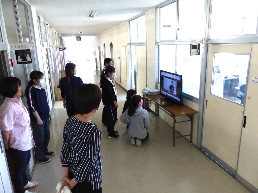 WEB教材を集めた大型テレビを職員室前廊下に設置し、多くの先生たちがお互いに見合っています。
