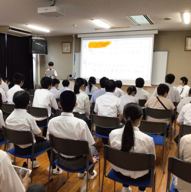 1年生は校内で(リサイクル班)(バンガラ班)に分かれて、初めての作業を体験します。2年生は集団実習で前期とは違う事業所で2〜3週間働かせていただき、3年生は前提実習としてそれぞれの事業所でお世話になります。緊張もし、疲れも出ると思いますが、社会に出て自立するために大切な練習です。教頭先生から「自分自身の進路についてしっかり考えること」「自分自身の課題解決のためにはどうすればよいか考えること」この2点についてがんばってほしいというお話を真剣に聞いている 姿が印象的でした。そして進路の先生より「お弁当を作ってくれるお家の人、受け入れてくださった事業所の人、応援してくれる先生、たくさんの人にありがとうの気持ちを忘れないように」というお話もあり、うなづいている人もいました。体調に気をつけて、有意義な実習にしましょう❗️