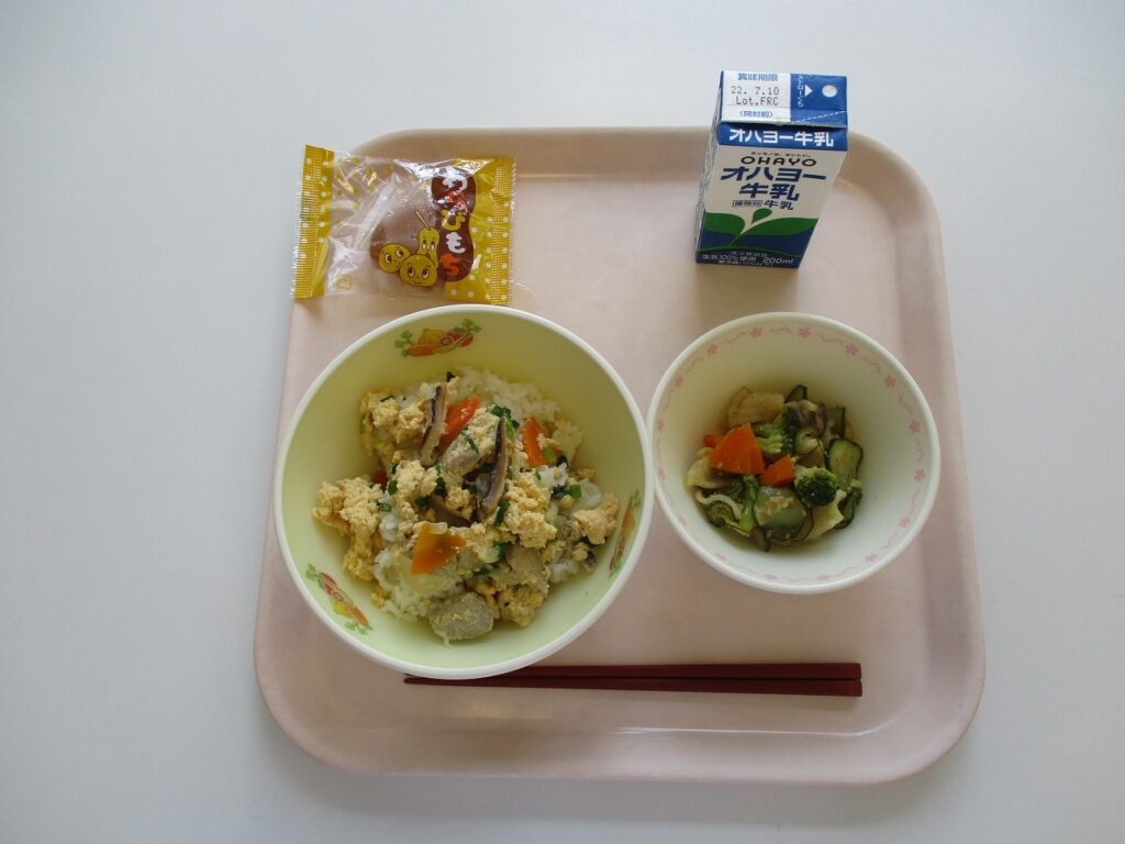 親子どんぶり 牛乳 花切りだいこんのごま酢あえ わらびもち