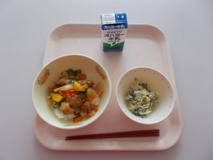 今日はピーマンやパプリカをたっぷり使った丼ものです。ピーマンもパプリカも同じ甘味種のトウガラシです。一般的に出回っているピーマンはシシ型と呼ばれる品種で、果皮が緑色のものを指します。これに対してパプリカはベル型と呼ばれる品種で、苦みが少なく、果肉が厚いことが特徴です。赤・オレンジ・黄色と果肉の色が鮮やかで、生でも食べやすいことからサラダやマリネ、炒め物に利用されます。給食ではパプリカの色や食感をなるべく残すように、さっと茹でて加熱したものを最後に混ぜ合わせました。