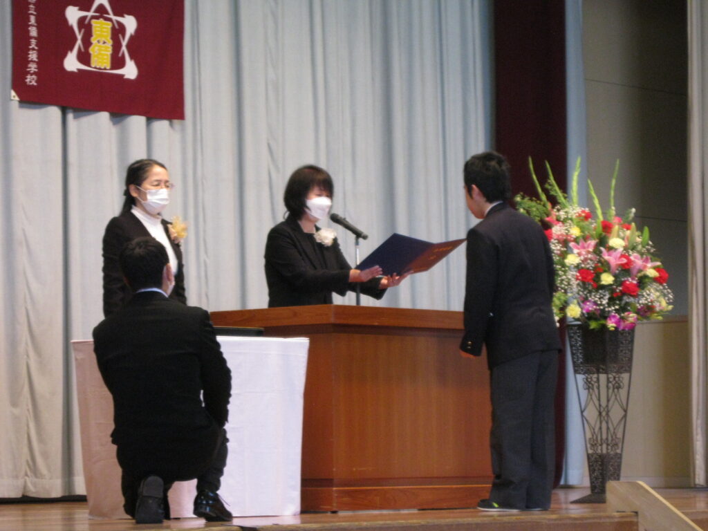 3月8日に高等部卒業証書授与式が行われました。暖かな春の日差しの中、19名の生徒が東備支援学校を巣立ちました。思い起こせば、入学後すぐに休校になり、制限の多い中での高校生活でしたが、仲間との絆を深め、いろいろなことに挑戦し、みんな優しくたくましく育ちました。ともに過ごした日々を胸に抱き、これからそれぞれの道を歩んでいきます。ご卒業おめでとうございます。