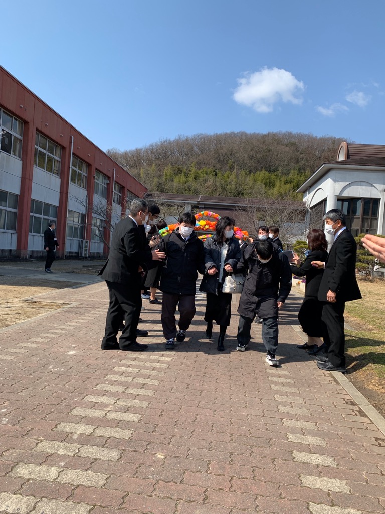 高等部3年生16名が東備支援学校を巣立ちました。思い起こせば入学式の日は雨からのスタートでした。そして新型コロナウィルス感染症のため行事がことごとく中止となり我慢することの多い高校生活でした。それでも友だちと後輩と力を合わせて色々な学習をし、その度に絆を深めていきました。校長先生からの言葉にもあった東備で学んだ「変化を受け入れ、対応していくとても大切な力」をこれからもしっかり発揮して下さい。