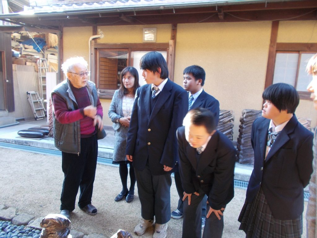 12月16日(月)高等部窯業班2年生4人が、備前焼人間国宝の伊勢﨑淳先生のご自宅を訪問し、備前焼作品のご指導をいただきました。 生徒の作った備前焼についての講評をいただき、先生の作品の見学や先生自らろくろで作品を作る様子を見学させていただきました。「まねではない、下手でもいい。自分の心を込めて、自分の作りたいものを作っていくこと。それが大事だ。」とご指導をいただきました。生徒4人、教員も、本当にすばらしい時間になりました。先生のご指導を生かして、がんばる元気がもりもり湧いてきます。