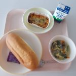 2020年9月14日 / 最終更新日時 : 2020年11月9日 tobisien10 米粉パン 牛乳 じゃが芋となすのチーズグラタン 卵スープ ブルーベリージャム 今日は久しぶりのパン給食です。グラタンはブラウンルウから手作りします。なすは素揚げしてから最後に加え、形をなるべく残し色もきれいに仕上げるようにしました。なすが苦手な人もおいしくいただけると思います。