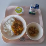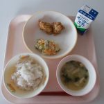 2020年9月17日 / 最終更新日時 : 2020年11月9日 tobisien10 麦ご飯 牛乳 鶏の唐揚げ 和風サラダ じゃが芋と小松菜のみそ汁 今日は小学部1年生からのアンコール給食「唐揚げ」です。唐揚げは人気№1献立です。肉屋さんから少し多めに届けられるため、それを“おかわり”用として出すのですが、あっという間になくなってしまいます。暑さで食欲が落ちていたのが […]